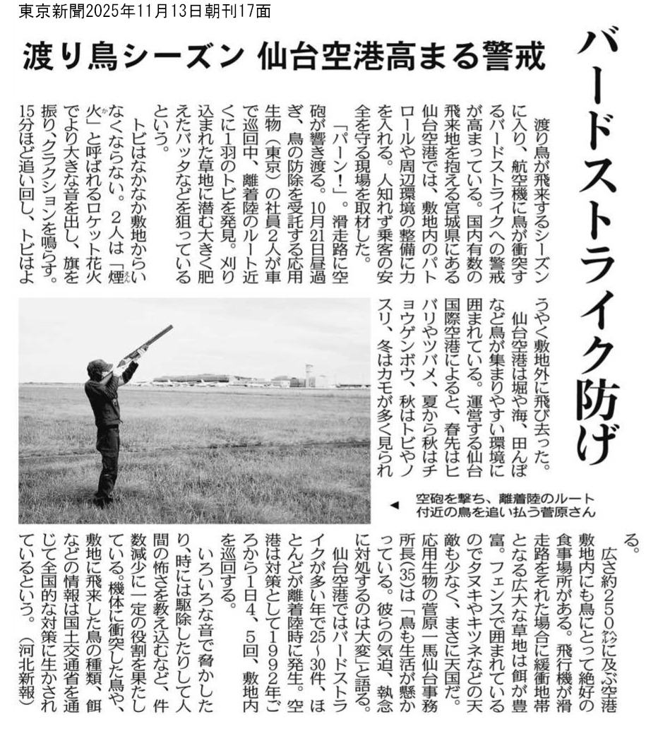 衝突データの分析、バードパトロール実務者への研修などのほか、近年は仙台国際空港においてバードパトロールによる有害鳥類防除業務も行っています。